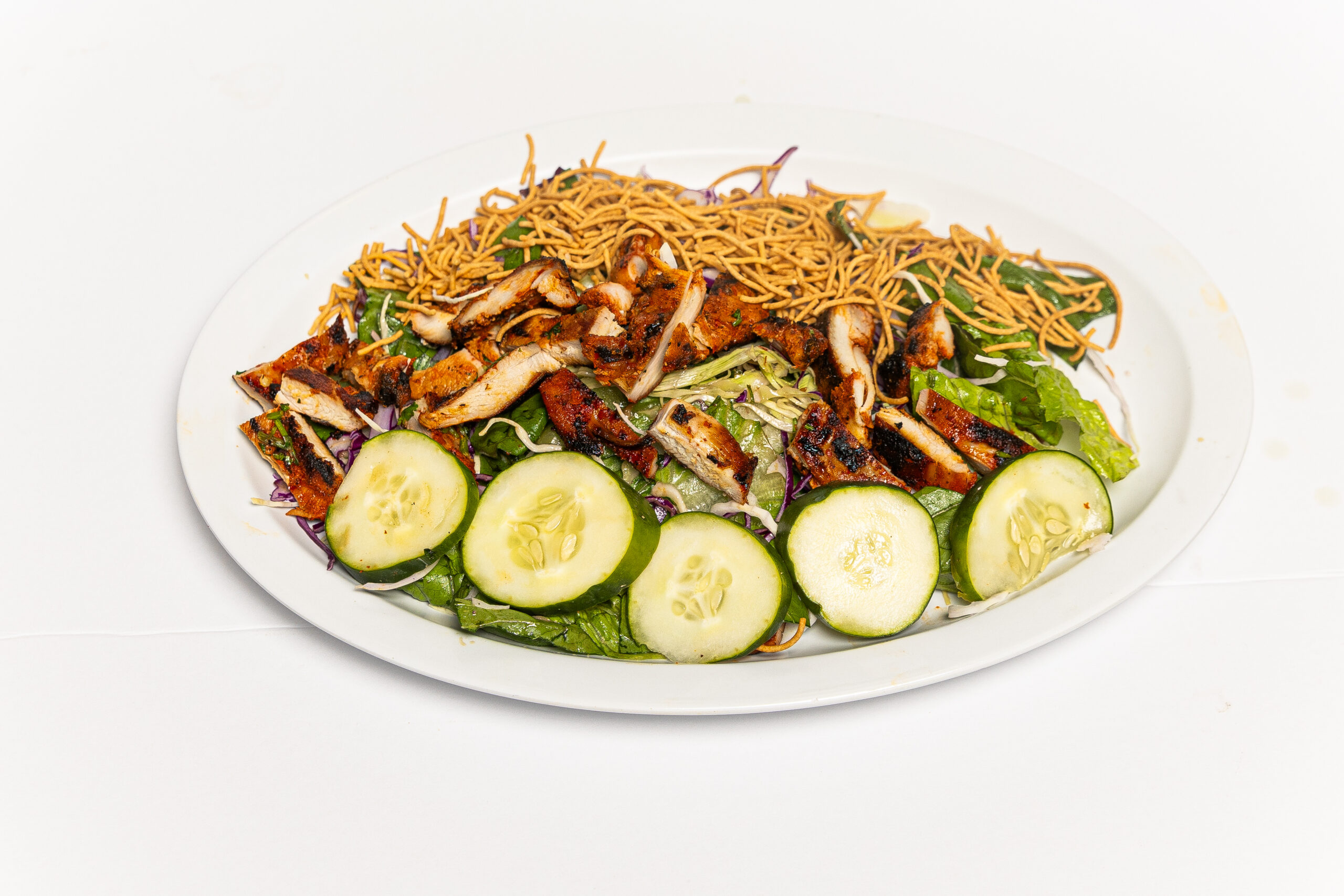 A refreshing coastal blend of shredded cabbage, romaine lettuce, grilled chicken, crispy noodles, cucumbers, . Fresh, crunchy, and full of flavor.